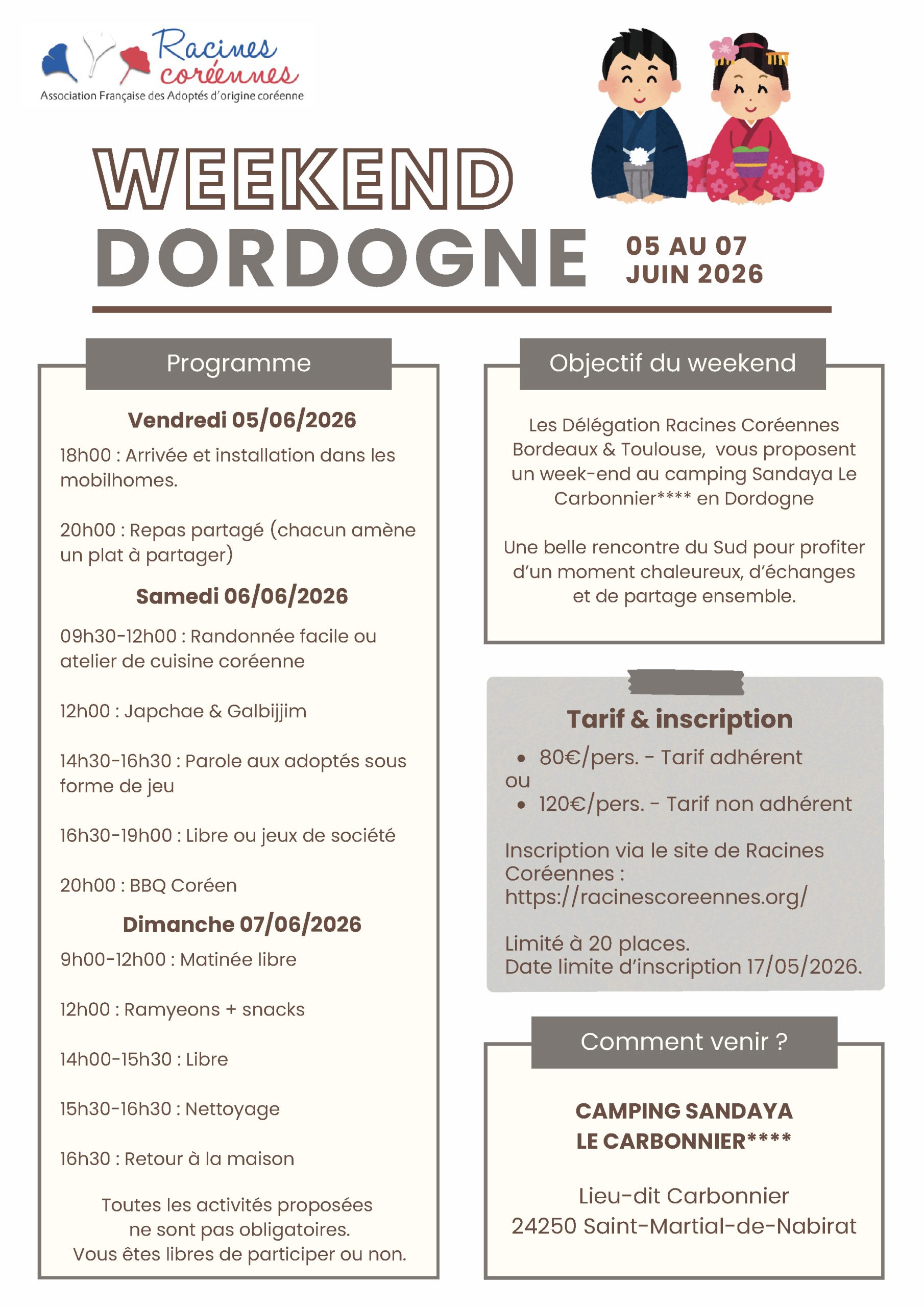 En vous inscrivant à cet événement, vous acceptez que Racines Coréennes publie des photos et/ou vidéos sur notre site internet et sur les réseaux sociaux afin de communiquer sur nos activités.