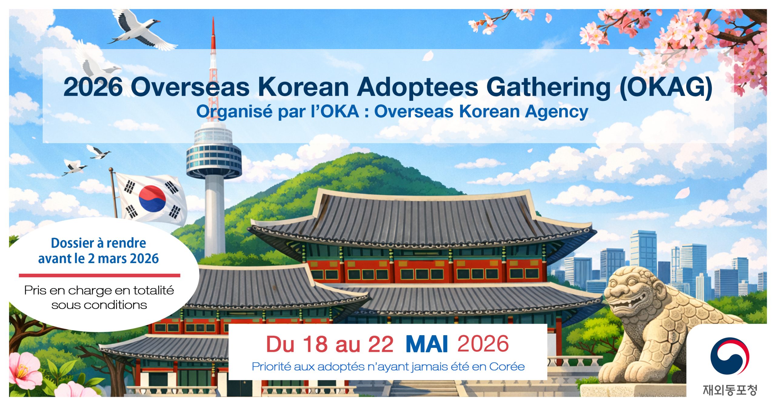 L'Agence National des Coréens à l'étranger (OKA : Overseas Korean Agency) organisera le « Rassemblement des Adoptés d'origine coréenne se trouvant dans le monde en Corée en 2026 (18-22 MAI) » en invitant en priorité les adoptés coréens qui n'ont jamais regagné la Corée depuis leur adoption. Cet événement consiste à renouer des liens avec la […]